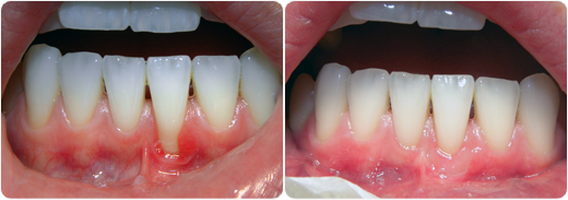 En cas de récessions gingivales, les racines des dents sont exposées et les dents paraissent plus longues.Les greffes de gencive peuvent réparer ces défauts et aider à prévenir l’aggravation des récessions ainsi que de la perte osseuse associée.